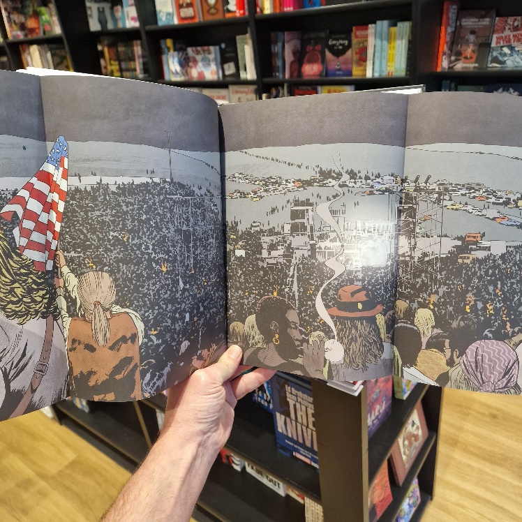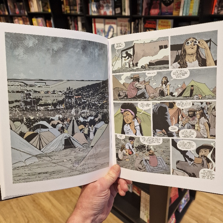 Spectacular! Festival fans, you are in for an era-soaked eye-popper as Charlie Adlard (WALKING DEAD, DAMN THEM ALL etc) delivers the most elevated and so evidently inspired art of his career. The toning techique is so very apposite, in perfect harmony with the richest colours, redolent of a baking hot summer and the high expectations of those on the road in search of cameraderie and musical bliss.
