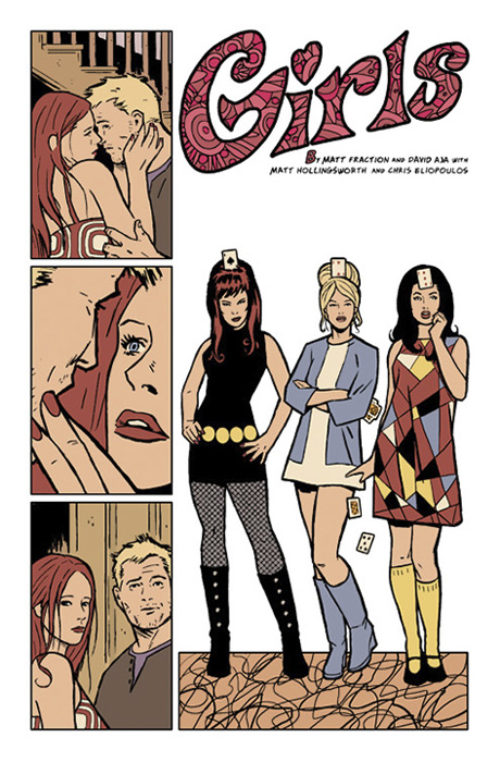 Then there are the ghosts of ex-girlfriends. Oh, not real ghosts, but imagine being caught snogging a damsel in distress (and in dat dress) by a) your girlfriend b) your ex-girlfriend and c) your ex-wife, all at the same time. Im not exactly sure what a motif is, but Fraction and Aja have turned that trio into one. Probably. They recurr, anyway, at the most inopportune moments.