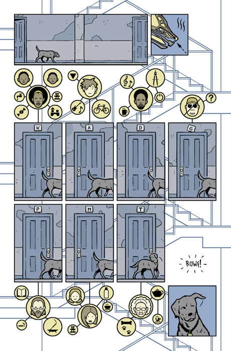 So yes, let us talk more about David Ajas design which with Hollingsworths white fills the comic with so much light. His tour de force here is the Pizza Dog issue, told entirely from Luckys point of view, wordless except for those basics the mutt might understand. His day is spent constantly interpreting the world around him through sound, smell and association, conveyed by Aja in maps of connected symbols worthy of Chris Ware himself (see BUILDING STORIES, JIMMY CORRIGAN and, particularly for symbols, the early pages of ACME NOVELTY LIBRARY #20). There is one seemingly throwaway moment where an absence of both sound and smell means everything.