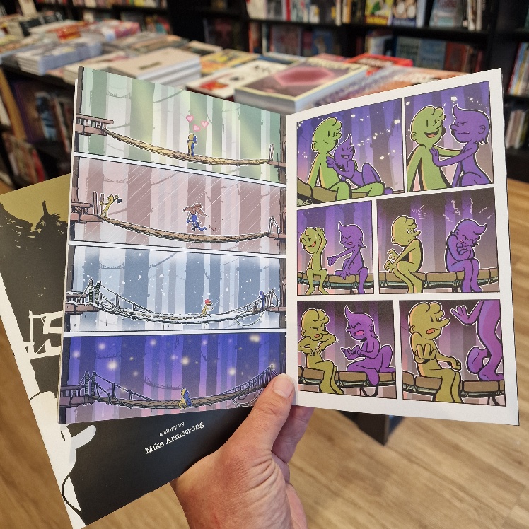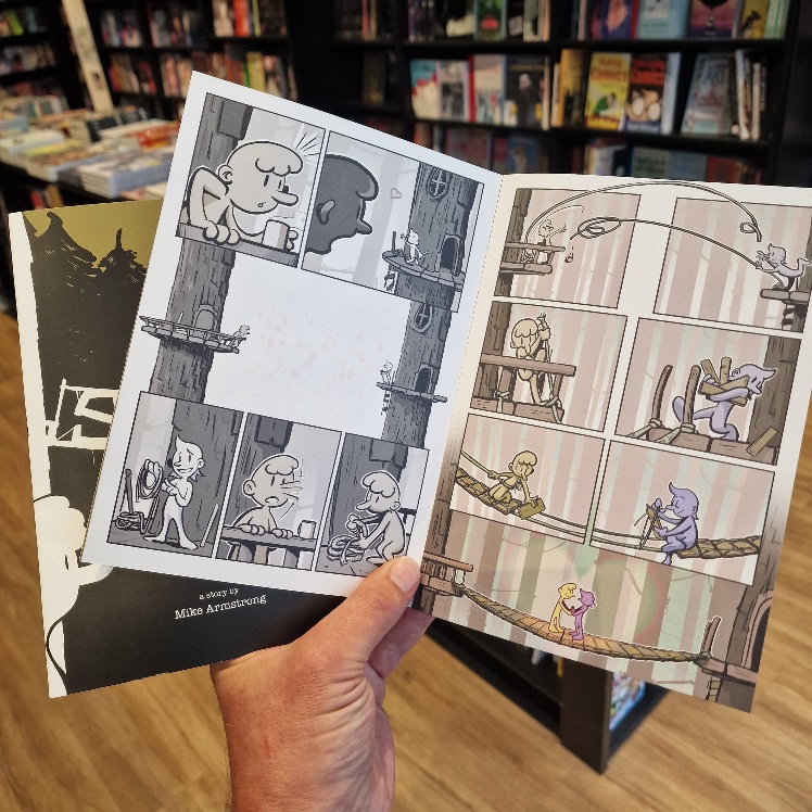 Such witty deployment of tone and colour! From the creator of BIGGER, this is equally succinct and just as profound. We watch our protagonist rise one misty morning in his tree-top community to find the rope bridge to his neighbour severed, but hey, you can always begin anew and they surely do! However.
