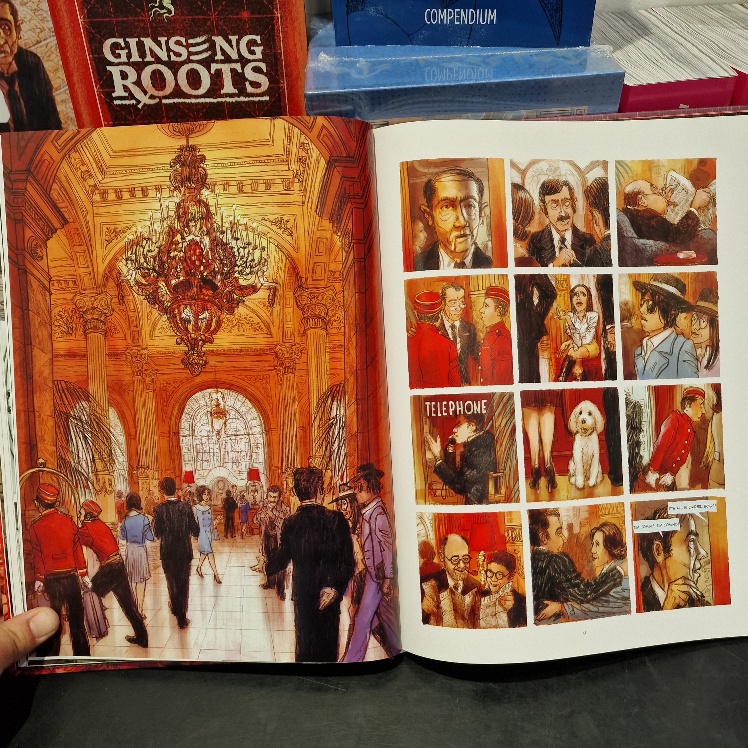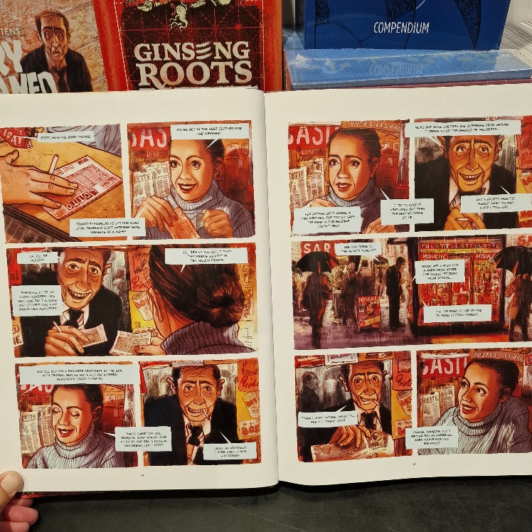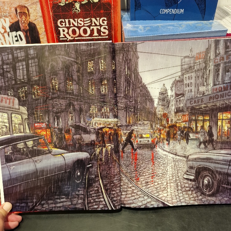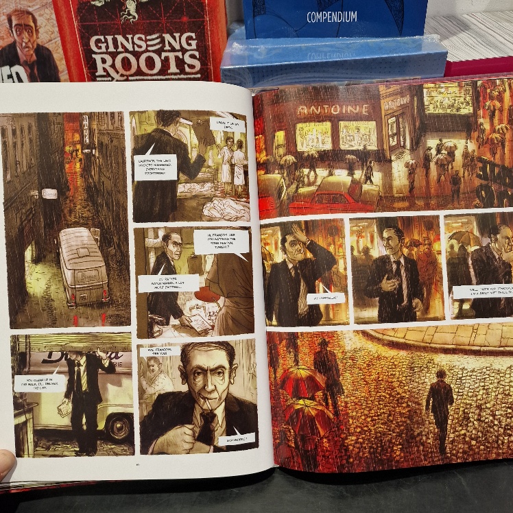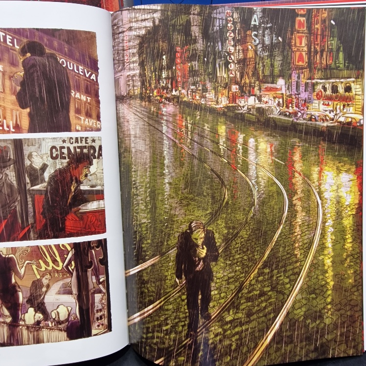 Cigarette clenched between teeth, Francois clutches his collar close to his throat as he hops between puddles to Mary Yvonnes newspaper stand to pick up a Sports Gazette and pop in his numbers for the National Lotto. Then its a waterslide stride across tram tracks to the Cafe Monico, and on every page the watery illuminations the swirling reflections from cars, street lamps and signage glow more and more magical.