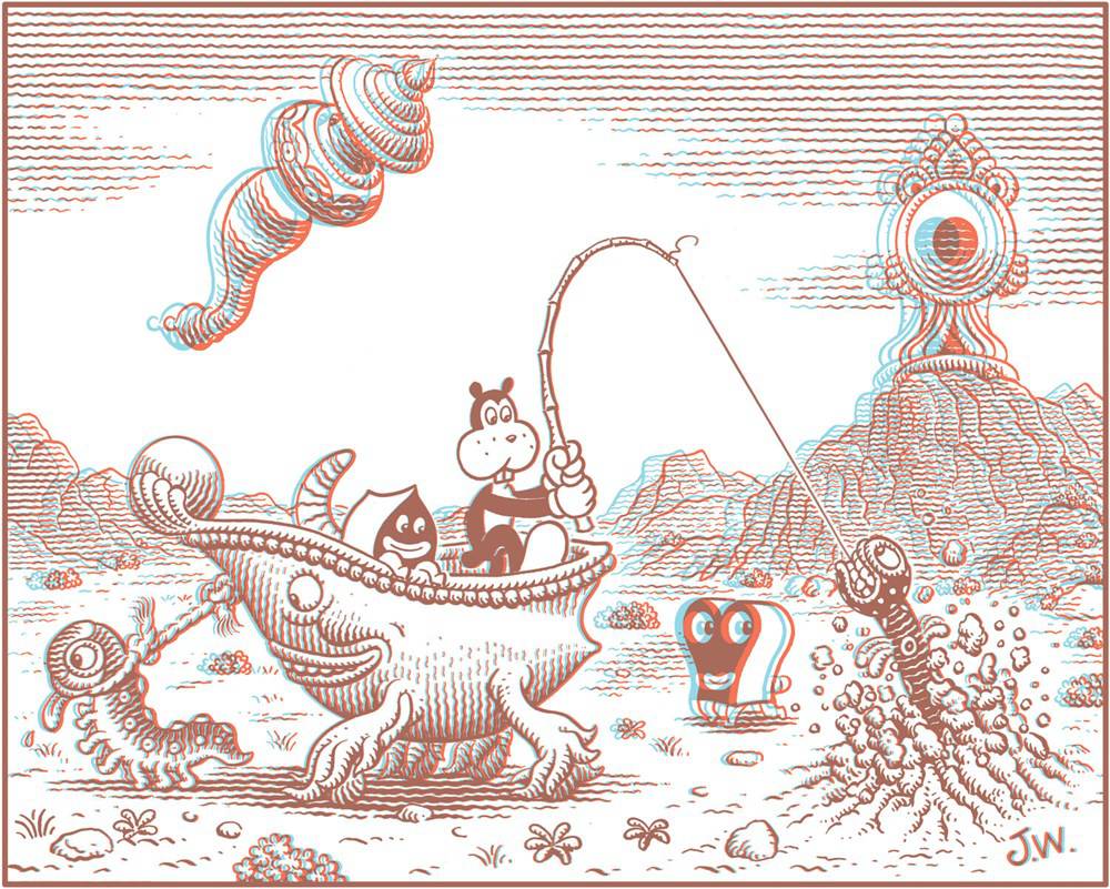 Frank In The 3rd Dimension is a series of Jim Woodring’s loveliest pictures — 32 anecdotal visual vignettes, dioramas, moments pickled in time — as you’ve never seen Frank before: in 3D, about as real as you can get him outside of an Ionescoian theatrical performance (which could be next — watch your local theater listings). Frank and Frank’s world are already hallucinatory, but seeing him in the most technologically advanced and artistically crafted 3D ever produced—more than 150 layers per drawing to round and “sculpt” each image into full, volumetric 3D — is an experience that has to be savored to be believed. Packaged with 3D glasses designed by Woodring himself, this new printing brings one of our most requested titles back into print again.