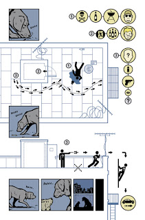 So yes, let us talk more about David Ajas design which with Hollingsworths white fills the comic with so much light. His tour de force here is the Pizza Dog issue, told entirely from Luckys point of view, wordless except for those basics the mutt might understand. His day is spent constantly interpreting the world around him through sound, smell and association, conveyed by Aja in maps of connected symbols worthy of Chris Ware himself (see BUILDING STORIES, JIMMY CORRIGAN and, particularly for symbols, the early pages of ACME NOVELTY LIBRARY #20). There is one seemingly throwaway moment where an absence of both sound and smell means everything.