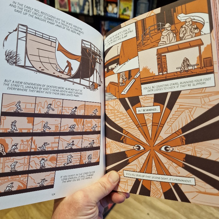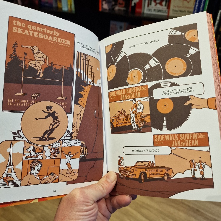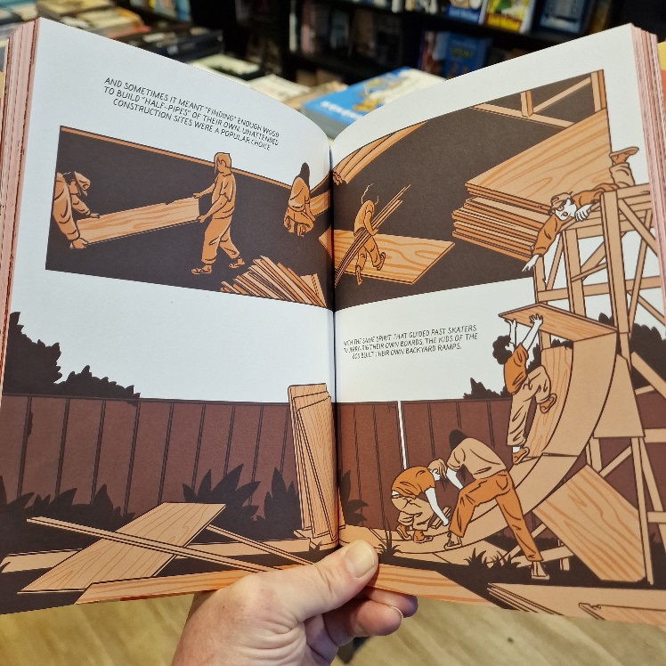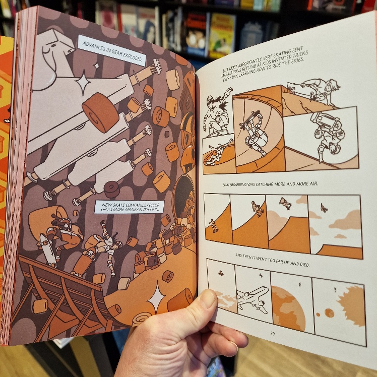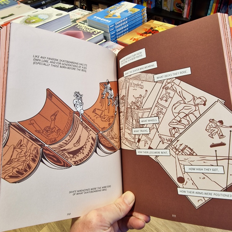 Yet another relentless succession of dull, rectangular panels would have robbed this of its freedom and zeal, but the artist is a surfer and it shows. Dumais' years as a skateboarder shine through too, for he'll take you on a revelatory, cross-cultural history lesson in skateboarding history from the first rudimentary steel-wheeled, homemade efforts, through commercial construction, vertical experimentation, trick perfection, early zines and social growth, then the shift in music from punk to hip-hop when skateboarders first roamed into city centres to repurpose whatever they found into brand new concrete challenges. In history, context is everything, and here you'll learn the when AND why as well as the who, what and how. All accompanied by a lyrical beauty, wit and especially insight: