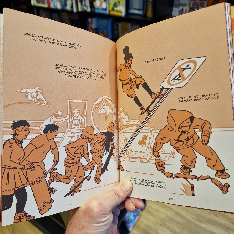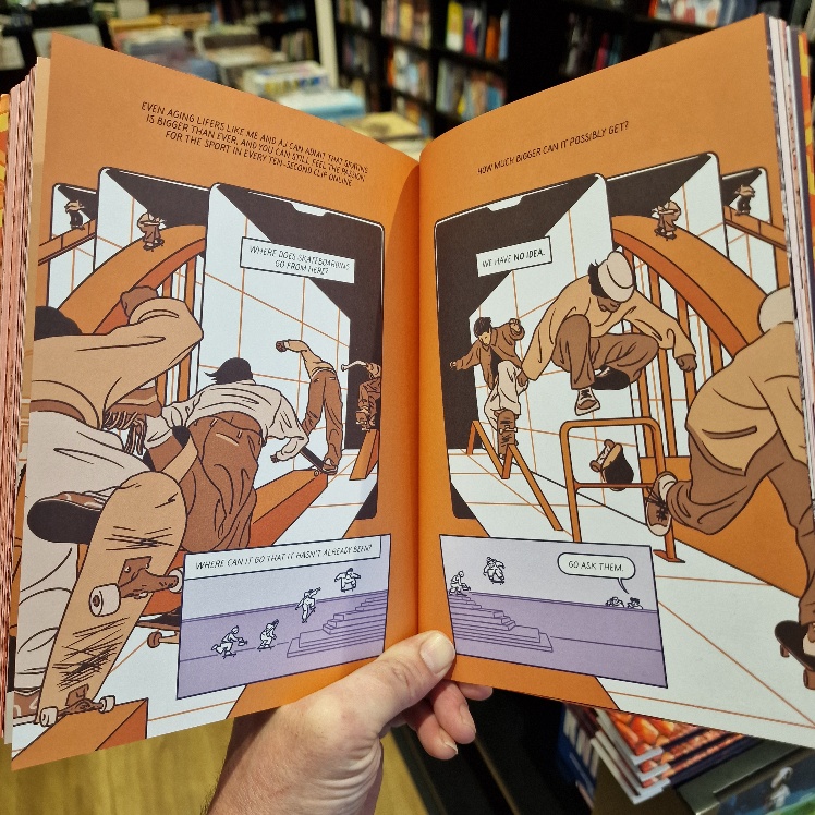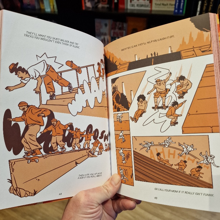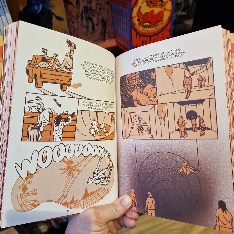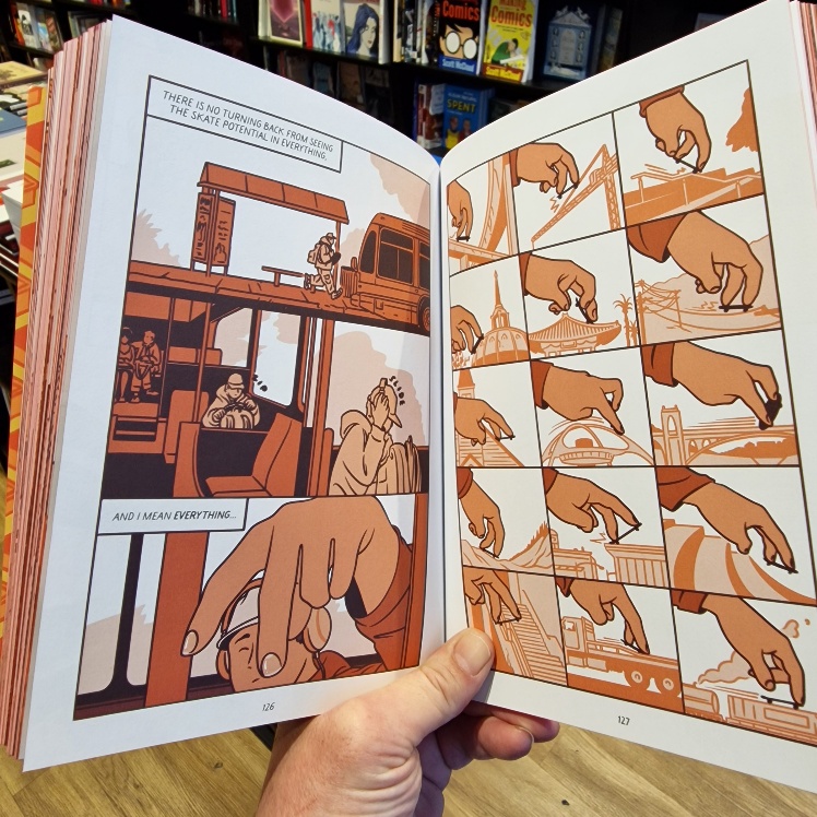One of the most visually thrilling, fluid and effervescent expression of comics as a medium, the skateboarders here flip and fly off every page from every conceivable angle! Arms thrust out, baggy tops and trousers back-flapping, they infect you with their gravity-defying faith, skill and joy!