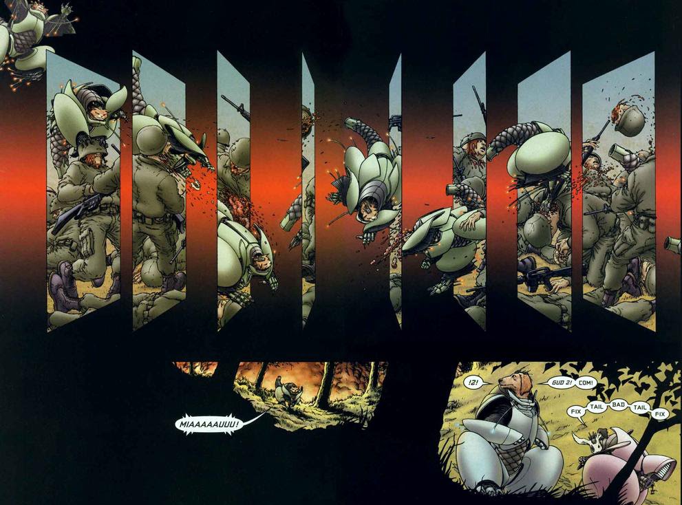 This edition features a twenty-eight-page sketchbook in which Morrison & Quitely explain their reasoning and design work behind the logo (dog collar disc / military name-tag melting in an act of liberation), the insanely detailed "animal-time" panels, some of them suspended then rotated for the cat to jump through (that double-page spread is an innovation of pure beauty!), the armour itself, the three front covers, and the unique physical artefact behind the six-page surveillance camera sequence which Quitely's family nearly binned by mistake! All of which are revelations that reaffirm one's love of creators who think outside the box about what they're putting on a page, how, and why.